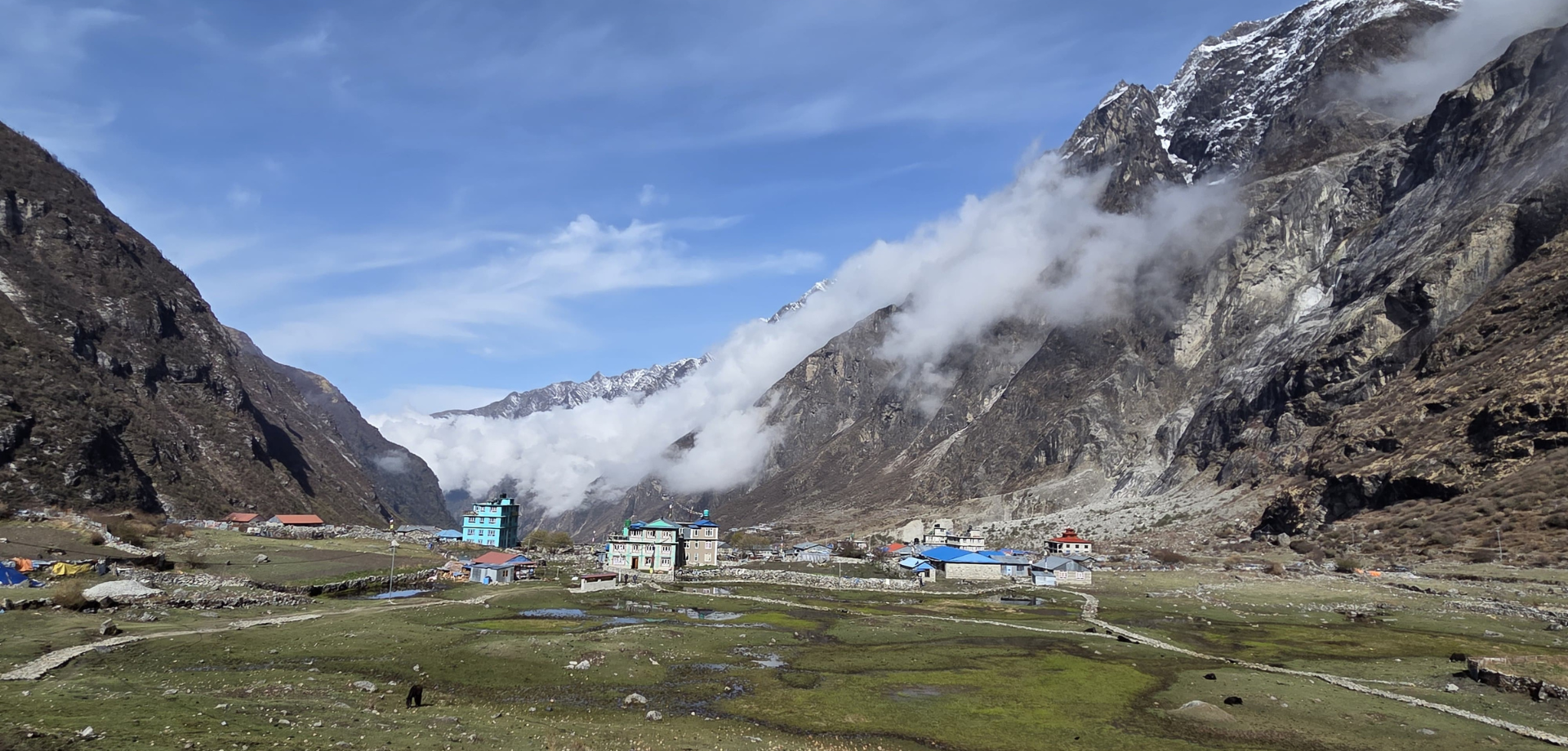 The old village of Langtang was completely wiped off the map by the 2015 earthquake. Since then, the village has been rebuilt 100 meters above the ruins of the old one. This new location is safer than the old one. It is still situated close to cliffs, but vertical cliffs are less susceptible to avalanches.